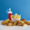 50-60g fully cooked chicken breast fillets strips. Great for dipping and sharing.